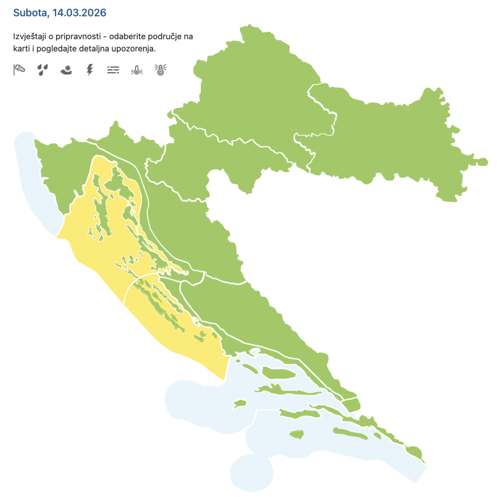 Zbog juga je DHMZ oglasio meteoalarm žutog stupnja.