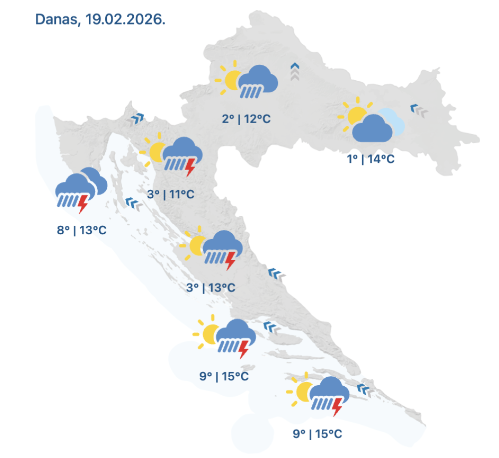 Zapad zemlje bit će pretežno oblačan i kišovit, osobito navečer, kada lokalno može pasti i obilnija kiša uz grmljavinu. U gorskim krajevima očekuje se umjeren do jak južni i jugozapadni vjetar. Na sjevernom Jadranu puhat će olujno jugo koje će prema večeri slabjeti i okretati na jugozapadnjak. Najviša dnevna temperatura bit će između 10 i 15 °C, dok će jutarnje vrijednosti u gorju biti oko 2 °C, a na obali od 5 do 10 °C.