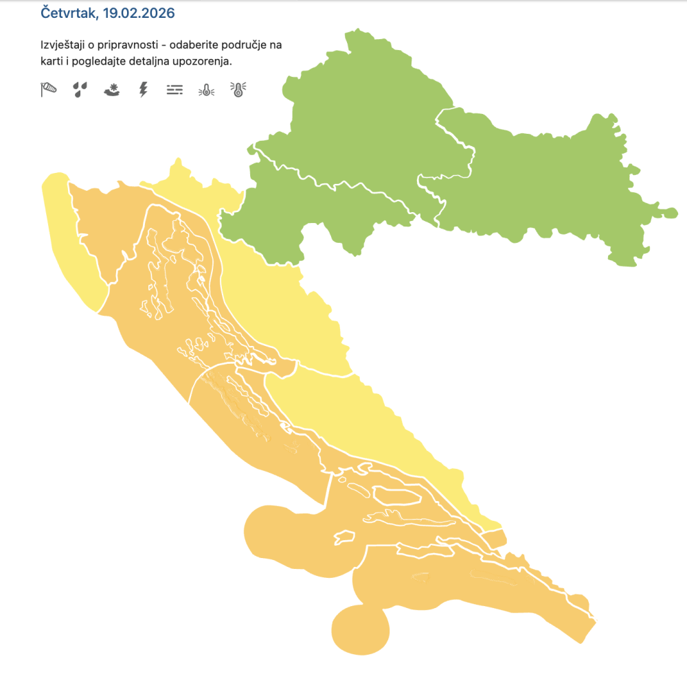 'Budite spremni na poremećaje, oštećenja konstrukcija i rizik od ozljeda zbog iščupanih stabala, polomljenih grana te letećih krhotina. Moguć je prekid prometa i prekid opskrbe električnom energijom', upozorio je DHMZ.