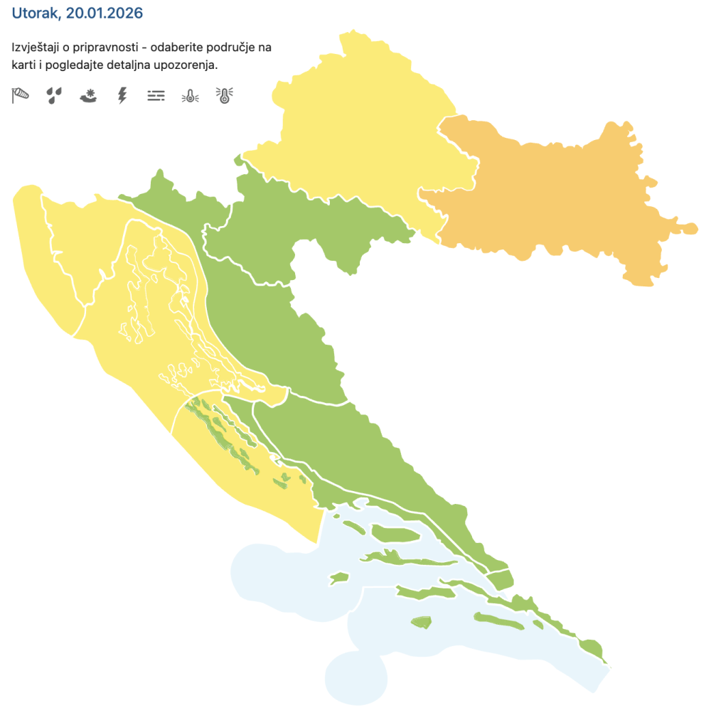 Na istoku Hrvatske dan će započeti vedro, ali uz izrazitu hladnoću; jutarnje temperature spuštat će se između -8 i -6 °C. Upravo zbog toga na snazi je narančasto upozorenje za hladni val. Tijekom dana puhat će povremeno umjeren istočni i jugoistočni vjetar, a maksimalna temperatura zadržat će se oko nule, između -1 i 1 °C.