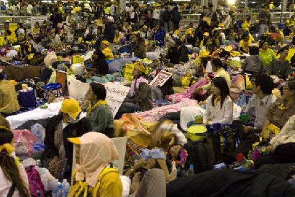 Takozvane 'žute košulje' su masovnim demonstracijama prvo zauzele zgradu vlade pokušavajući blokirati njezin rad, a nakon što im ta taktika nije uspjela, uselile su se u dva međunarodna aerodroma i blokirale ih, zatočivši tako 350 tisuća putnika. Prosvjedi su postali nasilni. Njihov jedini zahtjev je bio da A. Vejjavid postane premijer. Opsada aerodroma je završila nakon tjedan dana, ali tek nakon što je ustavni sud zabranio rad vladajuće PPP i dviju manjih koalicijske stranka optuživši ih za izbornu prijevaru te je zabranio premijeru Somchaiju Wongsawatu svaku političku aktivnost tijekom pet godina, kao i članovima stranke.