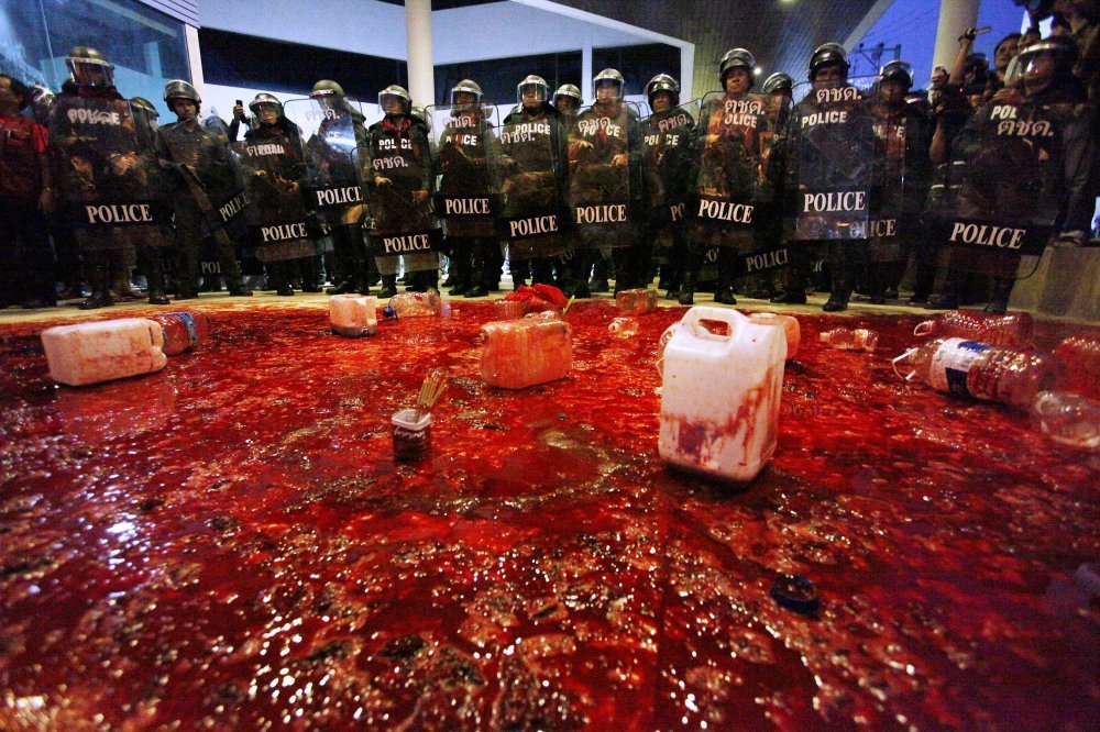 U Bangkoku ih se okupilo oko 100 tisuća, održali su jedan od najbizarnijih prosvjeda u ljudskoj povijesti prolivši po zgradi vlade 300 litara ljudske krvi. Nakon što je premijer odbio njihov zahtjev,