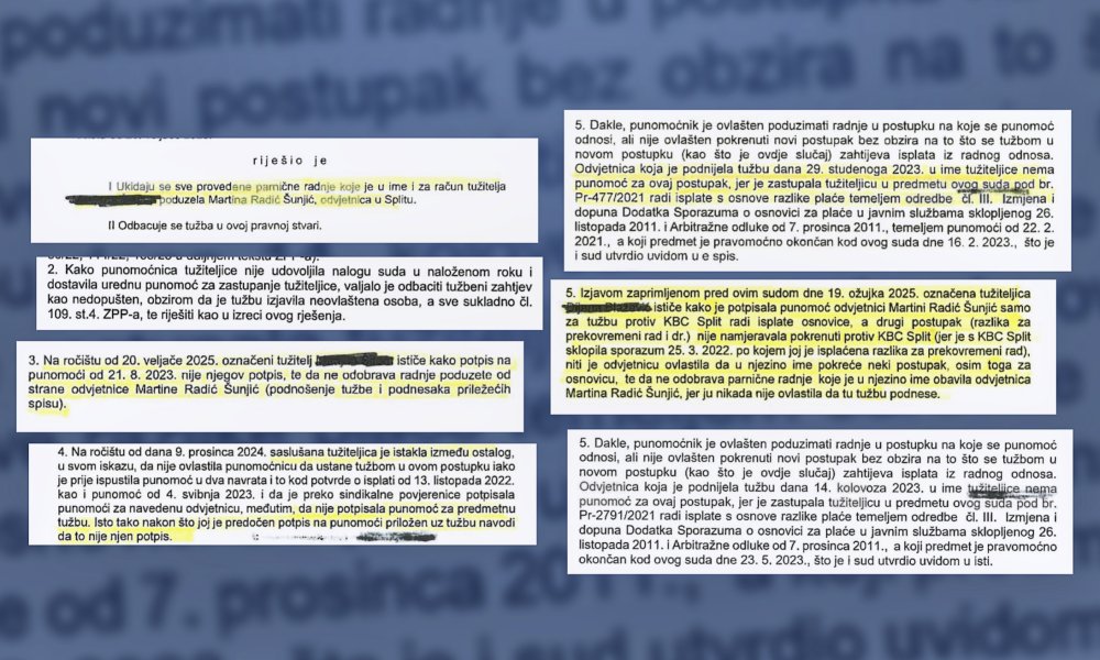 Tportal je u posjedu desetak pravomoćnih sudskih presuda u kojima su u tim postupcima ukinute sve sudske radnje nakon što je utvrđeno da radnici splitske bolnice - najčešće medicinske sestre - uopće nisu dali punomoć odvjetnicima u tim postupcima ili da na punomoćima uopće nije njihov potpis ili pak da odvjetnica nije ni priložila punomoć kojom bi bila ovlaštena za pokretanje postupka.