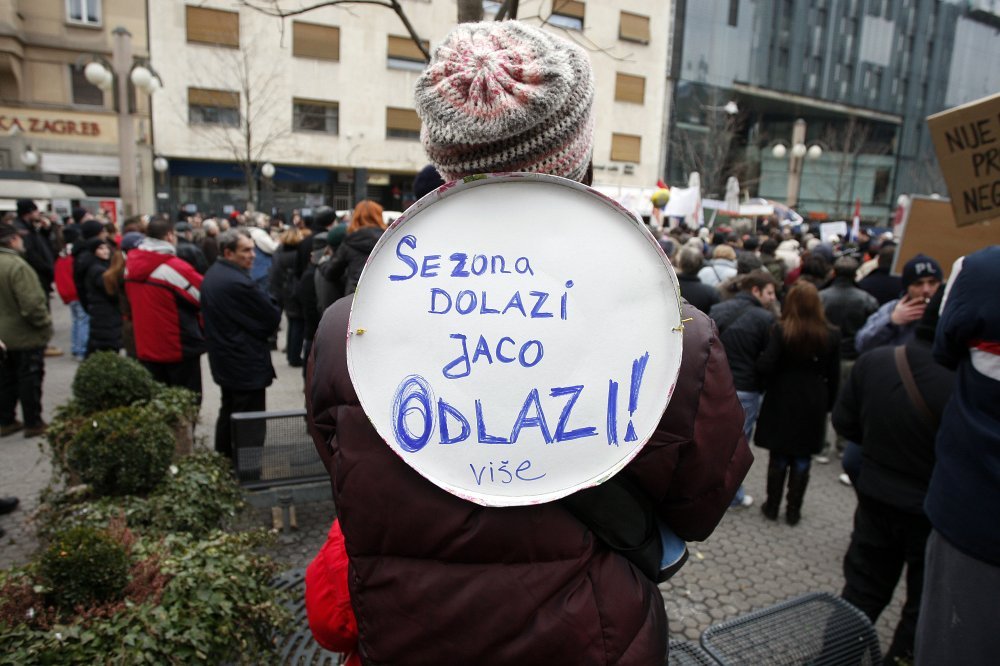 Workers were chanting "Everyone to the Streets" and carrying banners reading "Direct Democracy - Down with the Government, Down with Parliament," "Union? No Thanks," "We Don't Need Leaders To Decide - Direct Democracy," "Happy Women's Day, Jadranka," "Give back the money you stole."