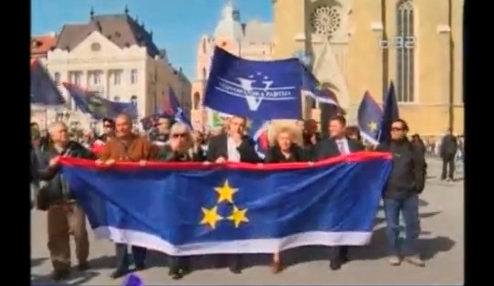 Građani su nosili zastave Vojvodine, transparente 'Vojvodina republika', stranačka obilježja Vojvođanske partije i puhali su u pištaljke.
