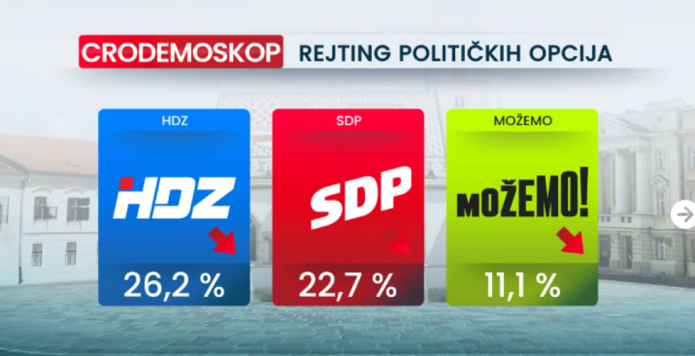 Crodemoskop za listopad pokazuje da je HDZ dalje je prvi izbor u Hrvatskoj s nešto iznad 26 posto no i treći mjesec zaredom bilježi pad podrške, dok je mjesec ranije ta podrška bila 28,16 posto