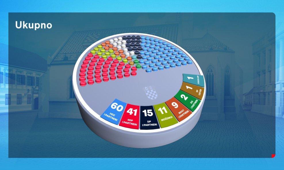 HDZ s partnerima ima uvjerljivo najviše mandata - 60. Druga je koalicija Rijeke pravde, osvaja 41 mandat. Treći je Domovinski pokret i njihova koalicija, oni imaju 15 mandata. Možemo! prolazi bolje nego dosad, prema istraživanju bi trebali imati 11 mandata, Most 9. U Sabor još ulazi IDS s dva mandata te Nezavisna platforma Sjever - iza koje stoji Matija Posavec - i koalicija Fokus-Republika s jednim mandatom. Krešić naglašava kako su u gotovo svim izbornim jedinicama po jedan, dva, a negdje i tri granična mandata te još uvijek jako visok postotak neodlučnih - u većini izbornih jedinica veći od deset posto.