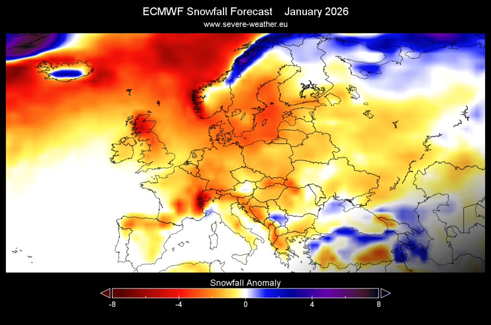 Prema ECMWF-u, najčešće korištenom i visoko cijenjenom sustavu sezonskog predviđanja, očekuju nad ispodprosječne snježne padaline na većem dijelu Europe, s glavnim područjima pomaknutim prema sjeveru, pod utjecajem zapadnih vjetrova i blažih uvjeta, piše Severe Weather.
