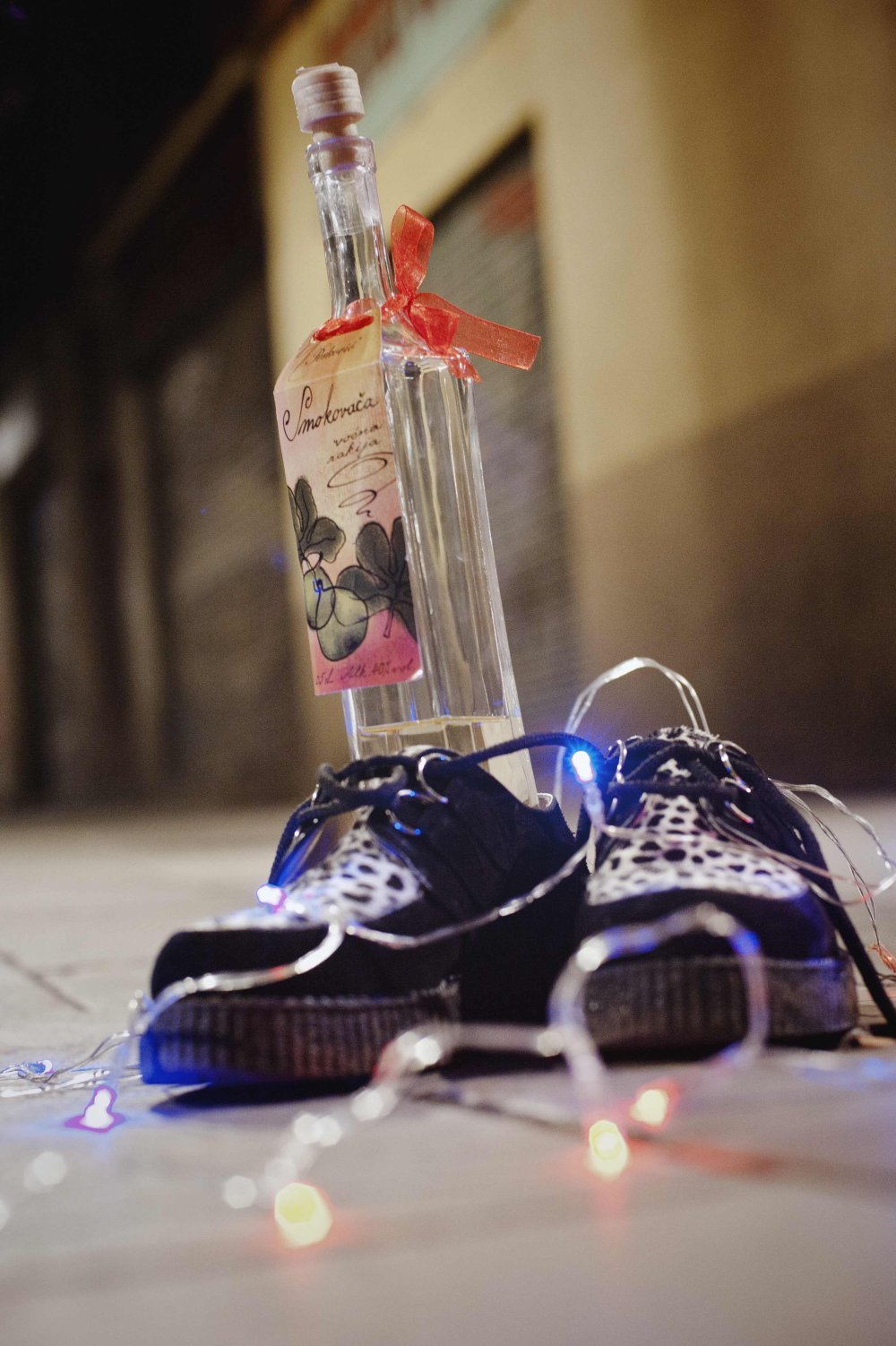 majica: (zaboravila sam kako se zove dućan u Barci, ali doznat ću), jakna: Zara, tajice: ebay, čarapice: Calzedonia, cipele: Jeffrey Campbell, prsten i naušnica: H&M, naočale: Kinkyflamingo, svjećice: Kinez, rakija: Perković