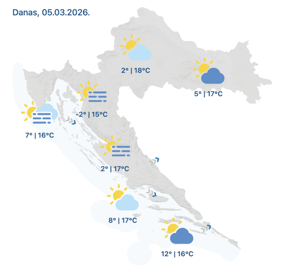 U četvrtak će u većem dijelu Hrvatske prevladavati stabilno i razmjerno toplo vrijeme, uz dosta sunca. Ipak, jutro će na pojedinim područjima početi uz maglu, a na istoku i krajnjem jugu može se pojaviti i poneka kap kiše