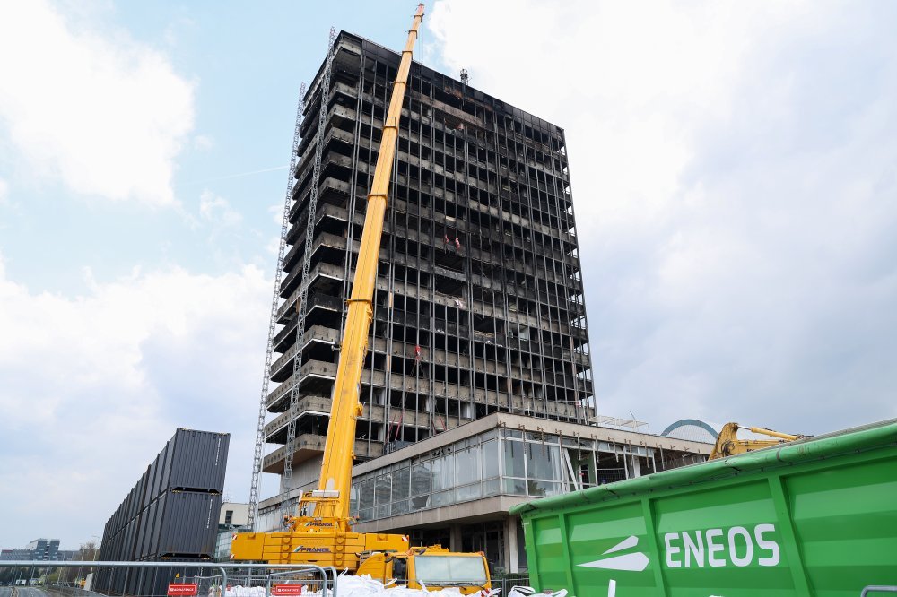 Nakon što su prije tjedan dana nakratko obustavljeni radovi na rušenju Vjesnika, jer je na posljednjem, 16. katu otkriven azbest kojim je bila obložena željezna nosiva konstrukcija, na poprištu se pojavila ogromna dizalica.