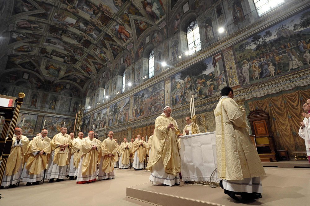 U Sikstinskoj kapeli, na istome mjestu gdje je izabran, Papa je govorio kardinalima na talijanskom jeziku. Imao je pripremljeni tekst, ali je dodavao svoje komentare koji su već postali prepoznatljivo obilježje njegova stila.