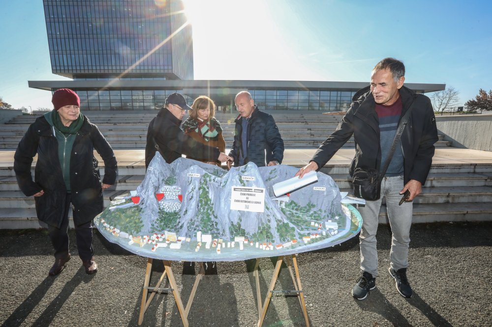 Predstavnici omiških udruga upozorili su u petak na nefunkcionalno rješenje omiške obilaznice performansom "Za zdrav razum nikad nije kasno" pred Ministarstvom mora, prometa i infrastrukture, uz izloženu maketu koja prikazuje prednosti i nedostatke projekata A i B.
