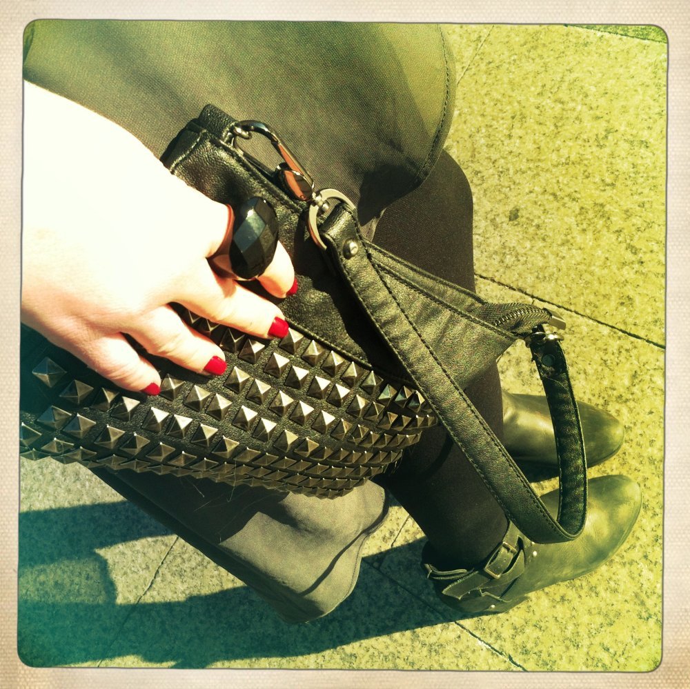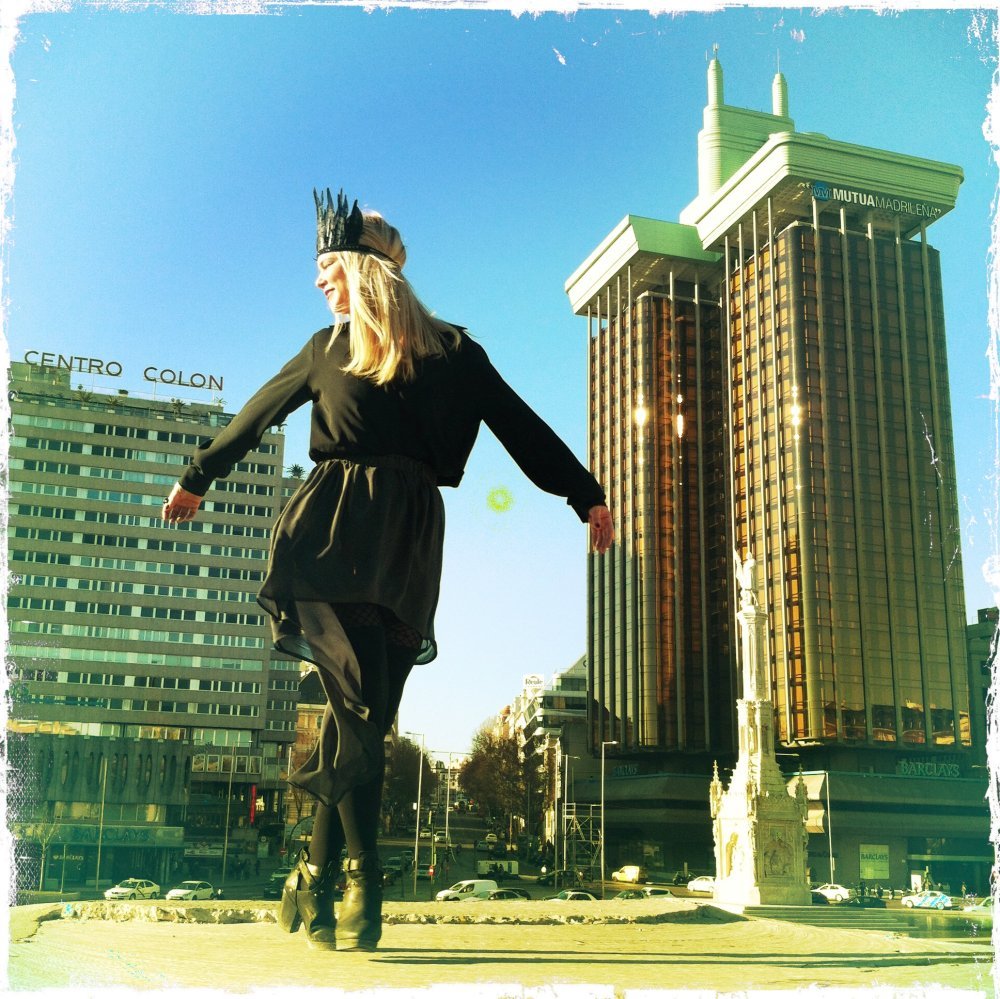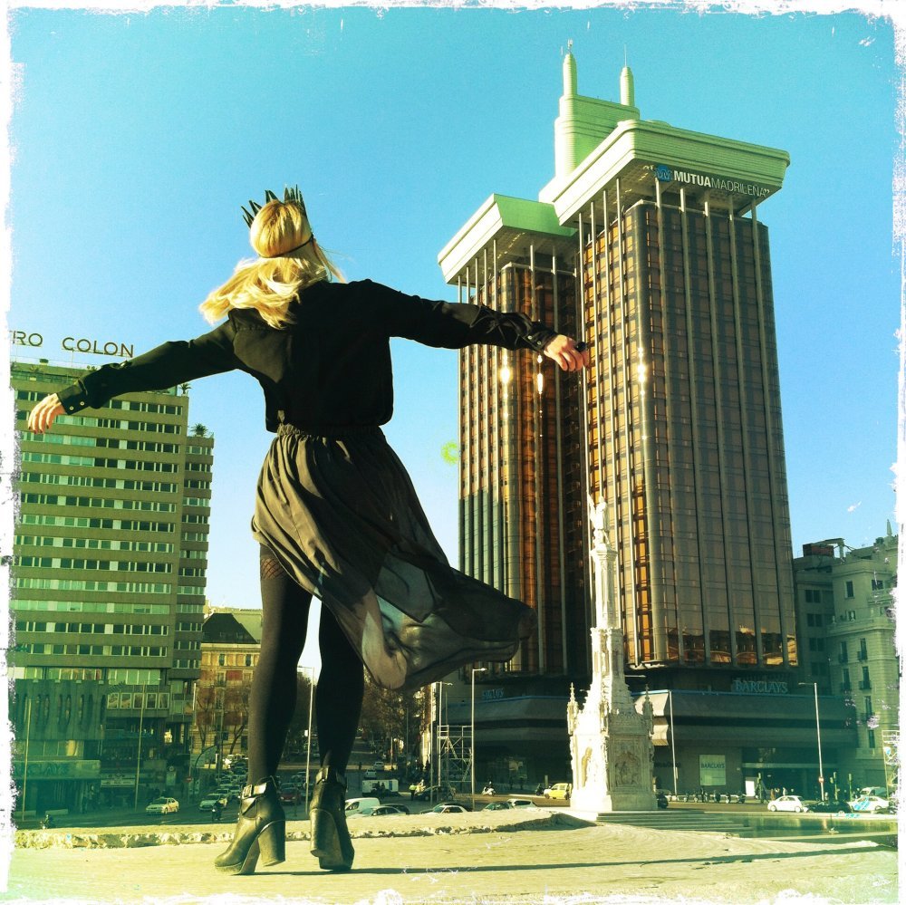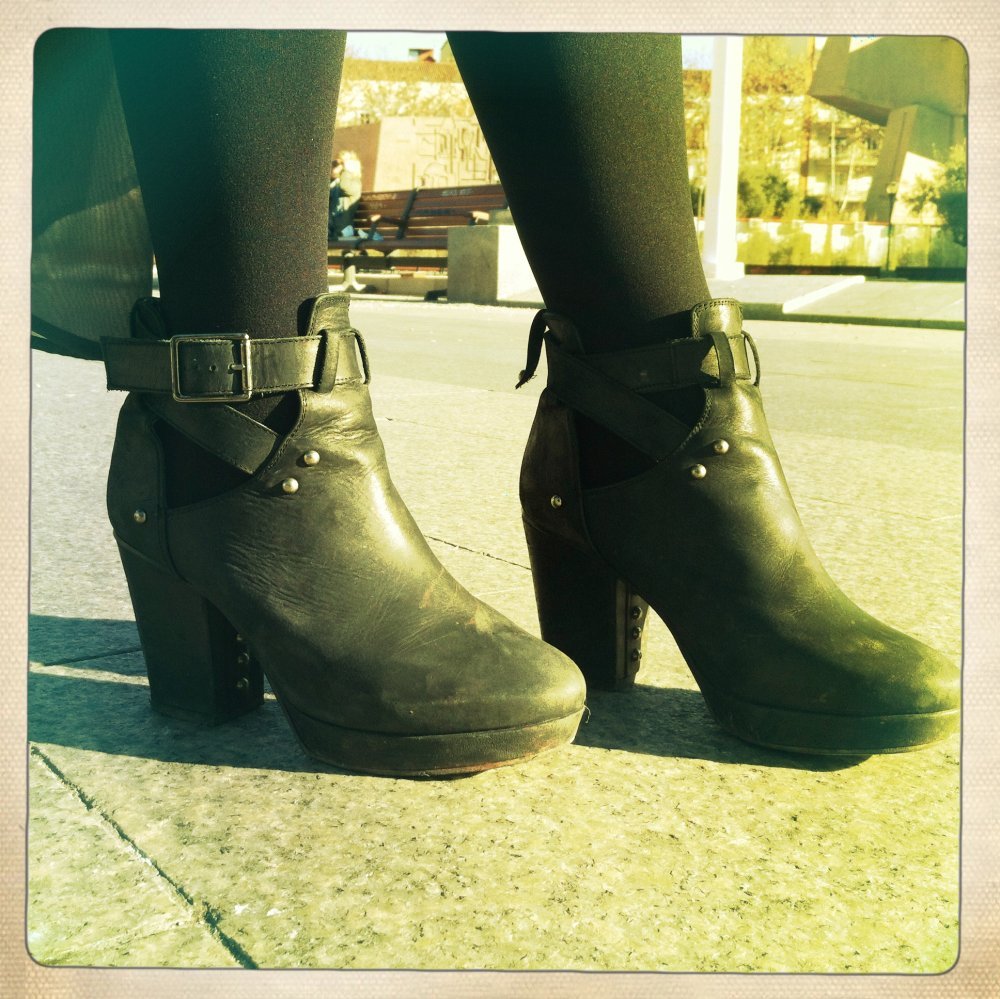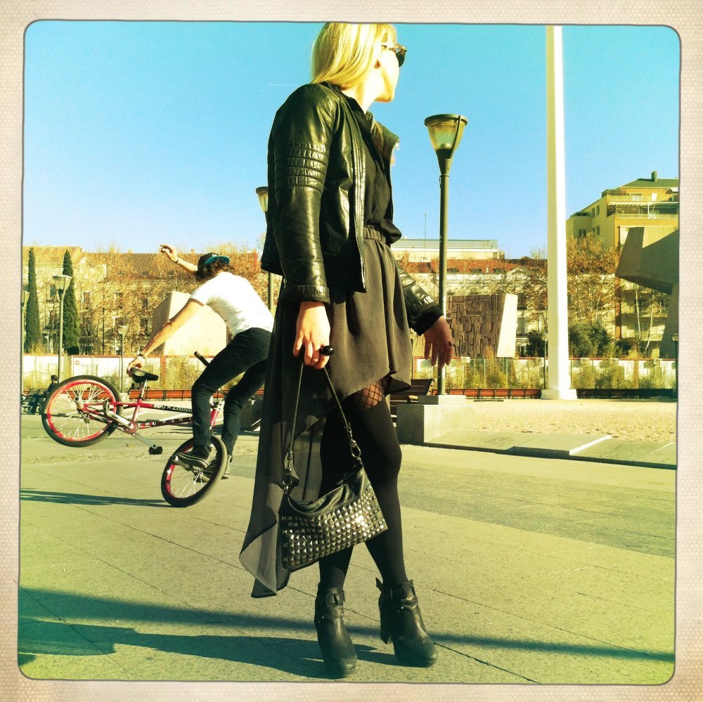 Moram priznati da me u posljednje vrijeme, iz potpuno nepoznatih razloga, privlače tamnije boje. Otkada sam u Zari pronašla ovu sivu poluprozirnu suknju, samo što u njoj ne spavam. Toliko je lagana da se osjećam kao da nemam ništa na sebi. Kombinirala sam je sa starom crnom košuljom, gustim crnim čarapama i crnim kožnim preudobnim r'n'r polučizmicama u kojima sam na Staru godinu propješačila kilometre i kilometre. S obzirom na neuobičajeno visoke temperature za ovo doba godine u Madridu, dovoljno je bilo prebaciti crni kožnjak.