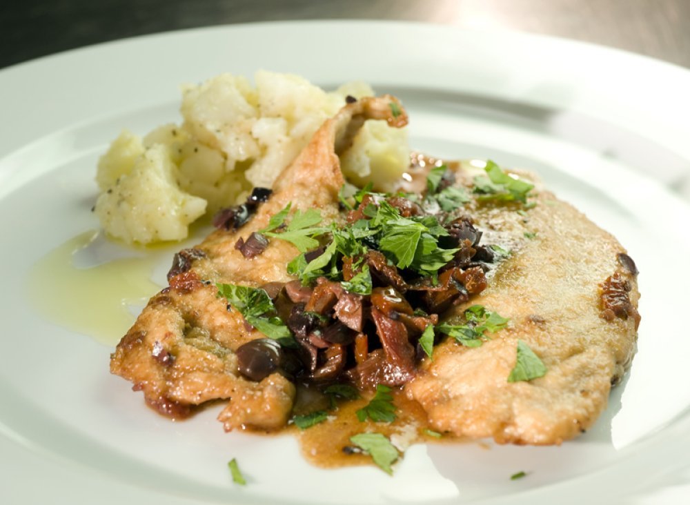U tavi u kojoj se peklo meso dodajte rajčice, vino, juhu, masline i pustite da dio tekućine ispari. Na kraju dodajte maslac i peršin i vratite meso u umak.