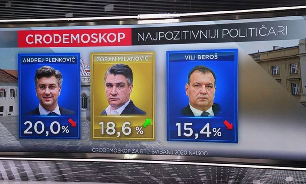Najpozitivniji političar u svibnju je premijer Andrej Plenković sa 20 postotnom podrškom, dok je predsjednik RH Zoran Milanović drugi sa 18,6 posto. Tako su obojica preskočili ministra zdravstva Vilija Beroša, koji je u travnju uvjerljivo bio prvi na toj ljestvici s podrškom od 29,2 posto. U svibnju se, s poboljšanjem epidemiološke situacije, ta podrška gotovo prepolovila na 15,4 posto. Ostali političari, iako im rejting raste, znatno su rjeđi izbor. Miroslav Škoro je na 4,1 posto, ministar financija Zdravko Marić 1,9 posto, a unatoč rastu SDP-a, još niže je njegov šef Davor Bernardić (1,6 posto). Načelnik Stožera civilne zaštite i ministar unutarnjih poslova Davor Božinović je na 1,4 posto, a listu 10 najpozitivnijih sa 0,8 posto zatvaraju Ivan Pernar, Gordan Jandroković i Marko Vučetić. Da je najpozitivniji političar "Nitko" stav je nemalih 15,4 posto ispitanika.