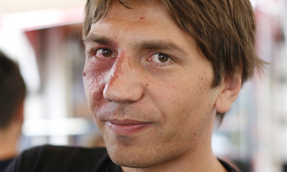 'Bio sam ljut što su prekinuli dobru atmosferu i zato sam im rekao da se gone u k...', priča Jabuka koji je zatim od jednog policajca dobio šaku u glavu nasred bine. 'Tada je nastao pravi kaos, ljudi su mi priskočili u pomoć, bio sam bijesan, izgubio sam živce i ispalio im nekoliko psovki jer znam da me ne smiju tući', nastavlja Jabuka kojeg su 'plavci' potom, kako kaže, zgrabili i uz prijetnje odveli u svoje vozilo. Putem su im, priča, neki cura i dečko viknuli da me ne tuku, a policajac je curu bacio na pod, zavrnuo joj ruku iza leđa i pritom joj potrgao kaput.