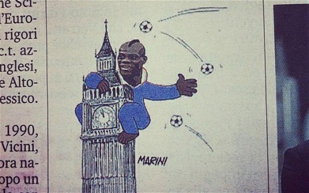 Strip prikazuje napadača Manchester Cityja kako stoji na vrhu londonskog Big Bena kako maše i odbacuje nogometne lopte, a kako tvrdi Gazzeta dello Sport strip je trebao biti duhovit i pozitivan u prikazivanju Balotellija kao diva koji je osvojio Englesku.