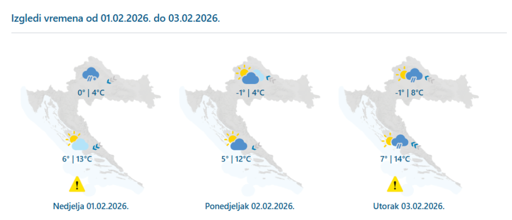 U nedjelju će u kopnenim krajevima prevladavati oblačno, mjestimice uz slabu sunježicu i snijeg, dok će unutrašnjost Dalmacije biti sunčanija i suha. Puhat će umjeren sjeveroistočni vjetar koji će u djelomice sunčan ponedjeljak oslabjeti. U utorak porast temperature i promjenjiva naoblaka, a prema večeri u Gorskoj Hrvatskoj kiša. Zapuhat će umjeren jugoistočnjak.