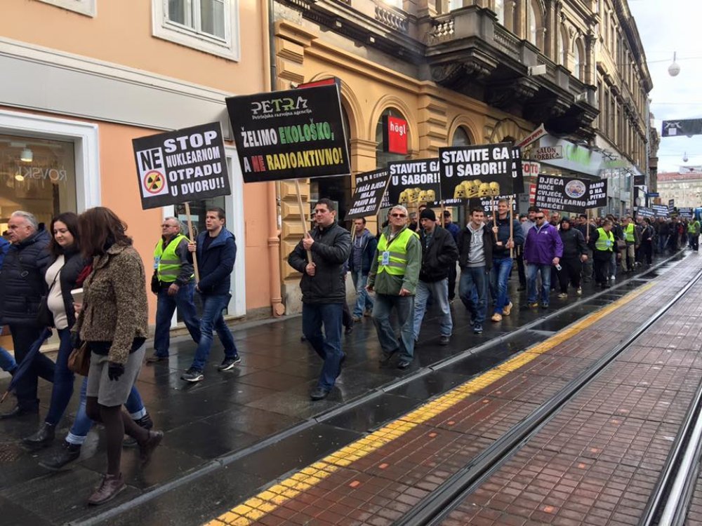 Prosvjednici nose brojne transparente, među kojima se ističu poruke 'Okupatori!!! Otimate nam našu zemlju naš život!', 'Stavite ga u Sabor', 'I naša djeca imaju pravo na zdravlje!!!', 'Želimo ekološko, a ne radioaktivno!', 'Hrvatska je do Une, ne do Kupe!', 'Gospodo, Una nema cijenu', 'I mi imamo pravo na čistu, pitku vodu', 'Djeca hoće cvijeće, ne nuklearno smeće!', 'Dosta je ove podmukle predstave!!' itd.