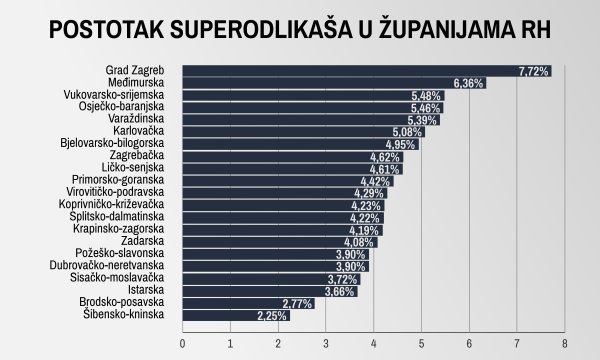 Najveći postotak superodlikaša je u Zagrebu, u kojem 7,72 posto učenika spada u ovu skupinu, te u Međimurskoj županiji s 6,36 posto učenika koji imaju apsolutni opći uspjeh od petog do osmog razreda.