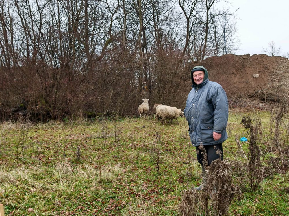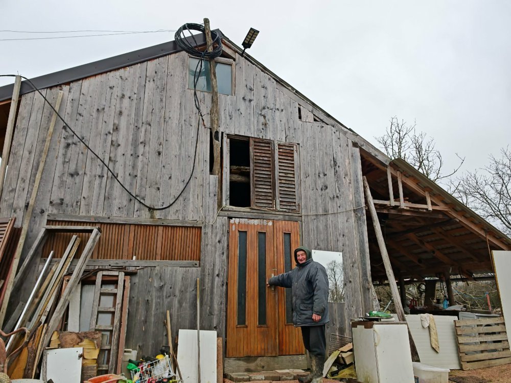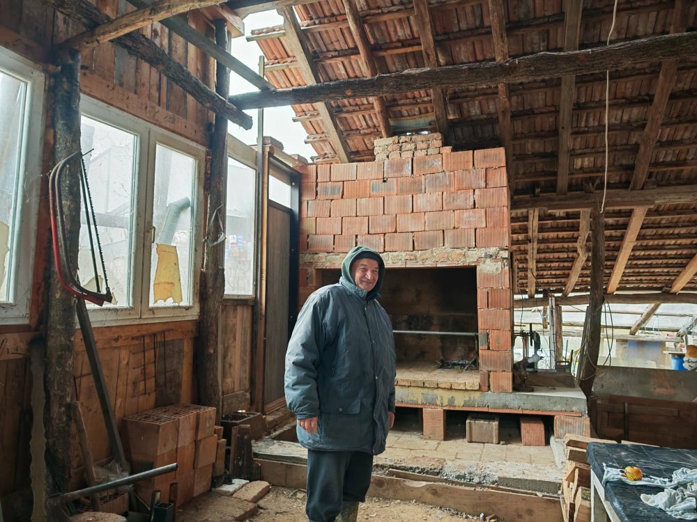 Proveo nas je po svojem imanju na kojem drži ovce i guske te ima štale i spremišta za drvo i prostor za pečenje na ražnju. Prije su te štale, priča nam, bile na rubu male uzvisine pokraj kuće. Ali, sada ih je spustio niže na svojoj parceli zbog klizišta, nakon što ih je sam izgradio. Proveo nas je i po kući gdje smo vidjeli teška oštećenja od prizemlja, sve do tavana. Prije rata i vojne mirovine, kaže nam, bio je inženjer strojarstva te radio na zaštiti na radu, što objašnjava njegova domišljata rješenja za učvršćivanje teško oštećene kuće.