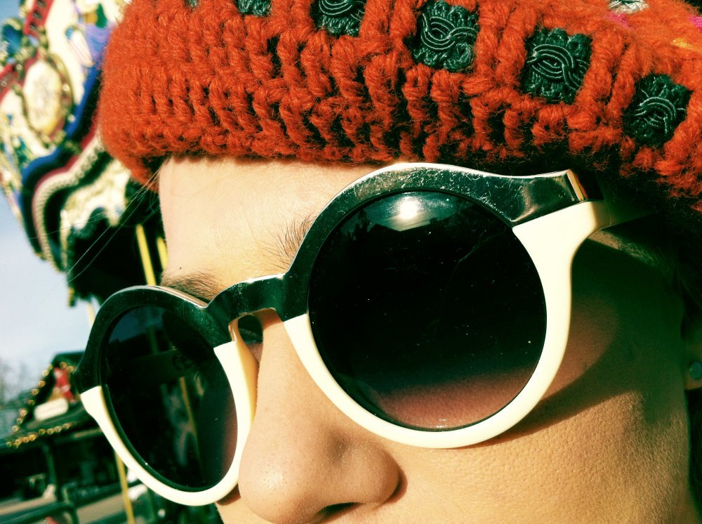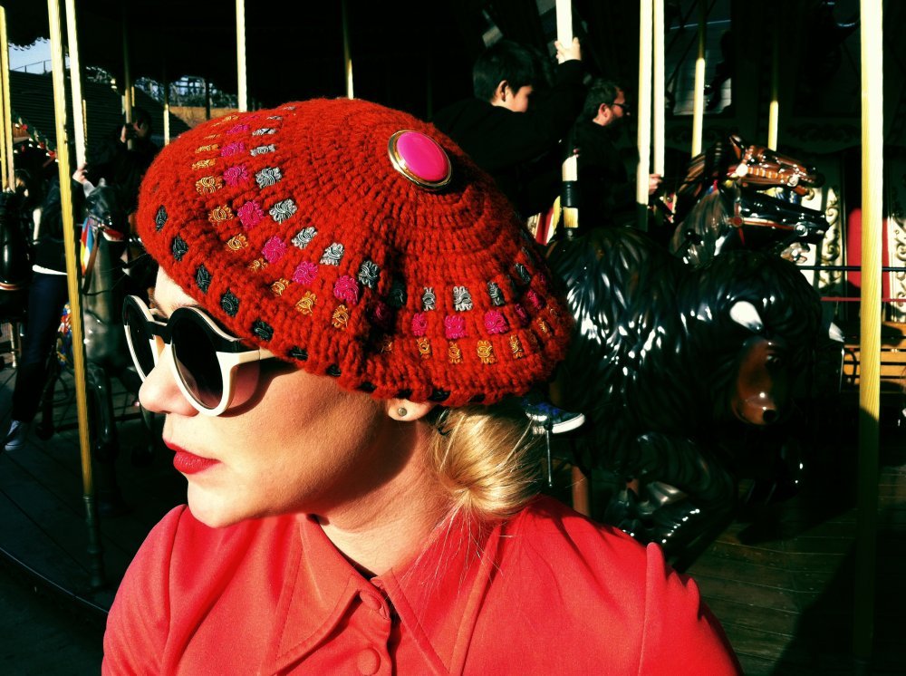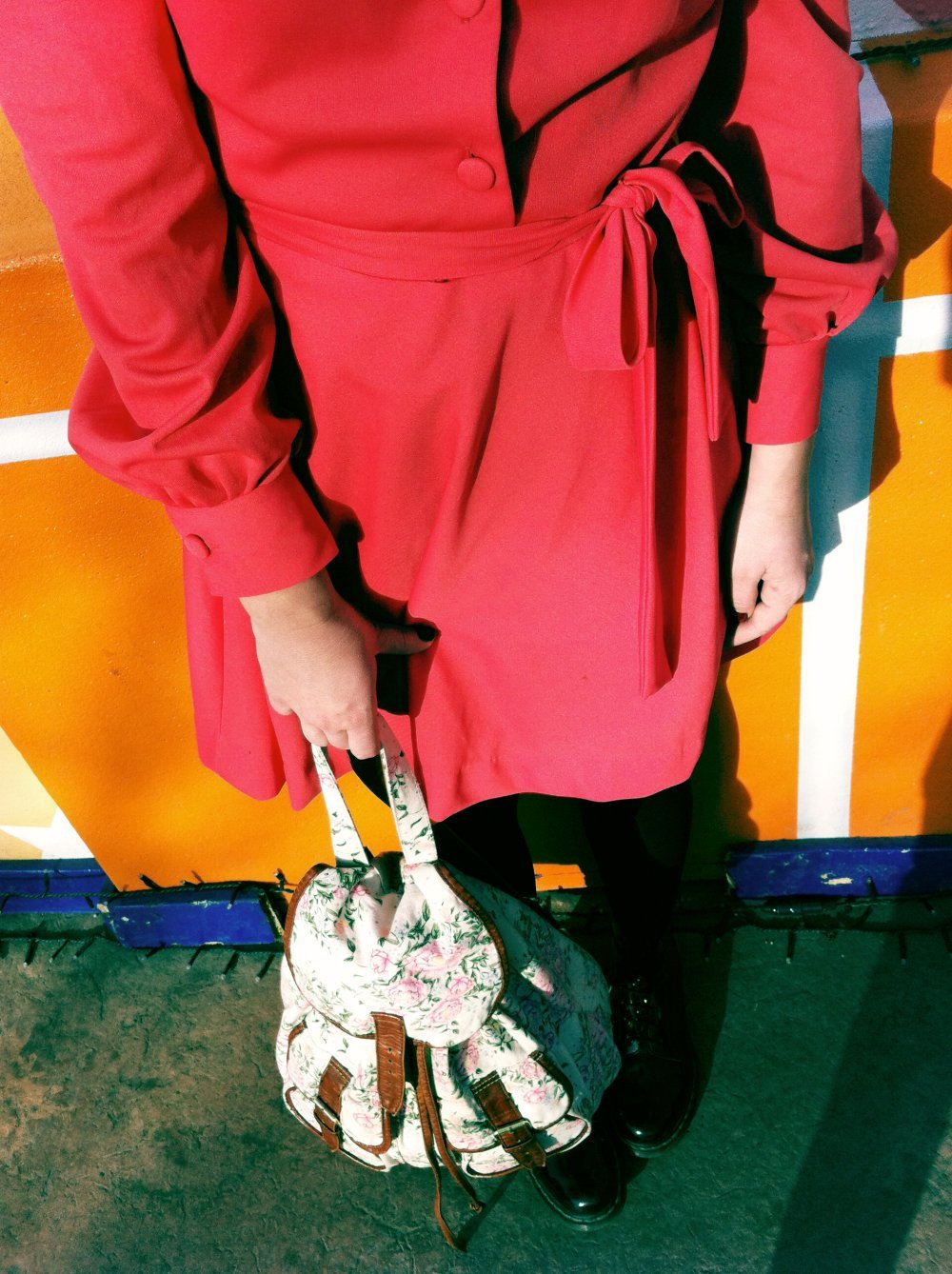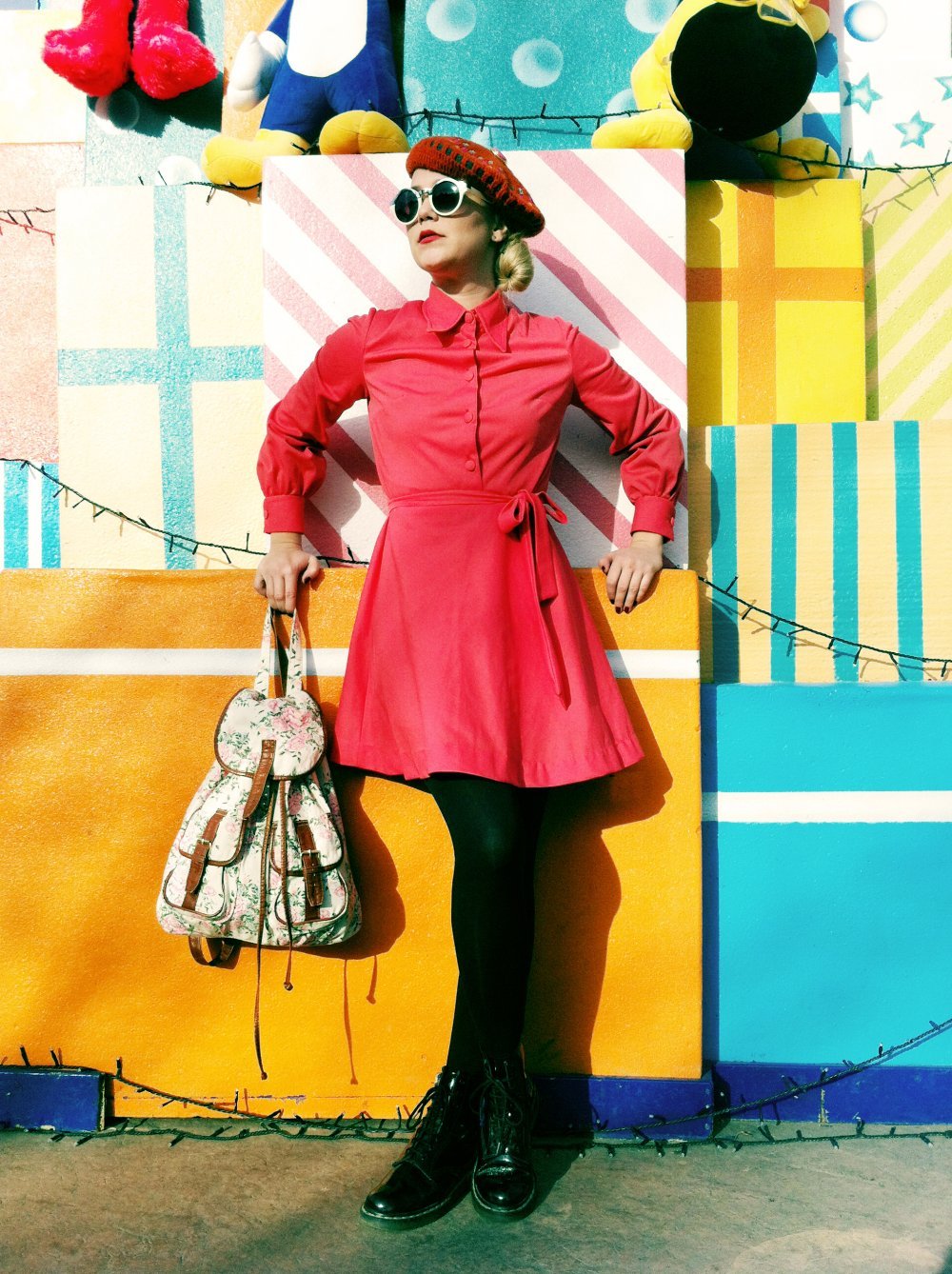 Ovu kričavu haljinu od poliestera (to joj je najveća mana, zato je rijetko i nosim) kupila sam na odličnom milanskom buvljaku prije šest godina za samo pet eura. Iako boje nisu identične, kombinirala sam je s predivnom heklanom beretkom, ručnim radom Ružice Jovičević, mlade dizajnerice iz Splita o kojoj sam nedavno pisala. Sve sam umirila gustim crnim čarapama i crnim lakiranim martensicama. A kombinaciji sam dodala na random izabrana dva detalja iz prošlogodišnje H&M-ove kolekcije: naočale i ruksak.