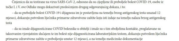 Osobe koje su imale 'dijagnosticirane COVID bolesnike u obitelji i imale su s tim oboljelima kontakte, proglašavane su takozvanim vjerojatnim slučajem te im bolest nije dijagnosticirana laboratorijskim testom, dokazuju potvrdom liječnika primarne zdravstvene zaštite o preboljenju unutar 12 mjeseci, a na temelju medicinske dokumentacije', stoji u Odluci.