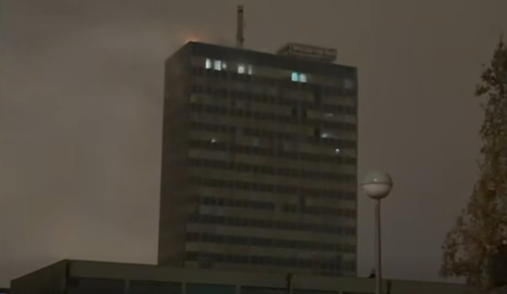 Društvenim mrežama se širi snimka na kojoj se vidi kako se iznad krova Vjesnika nazire vatra dok istovremeno unutar zgrade nekolicina ljudi bježi s upaljenim baterijskim lampama