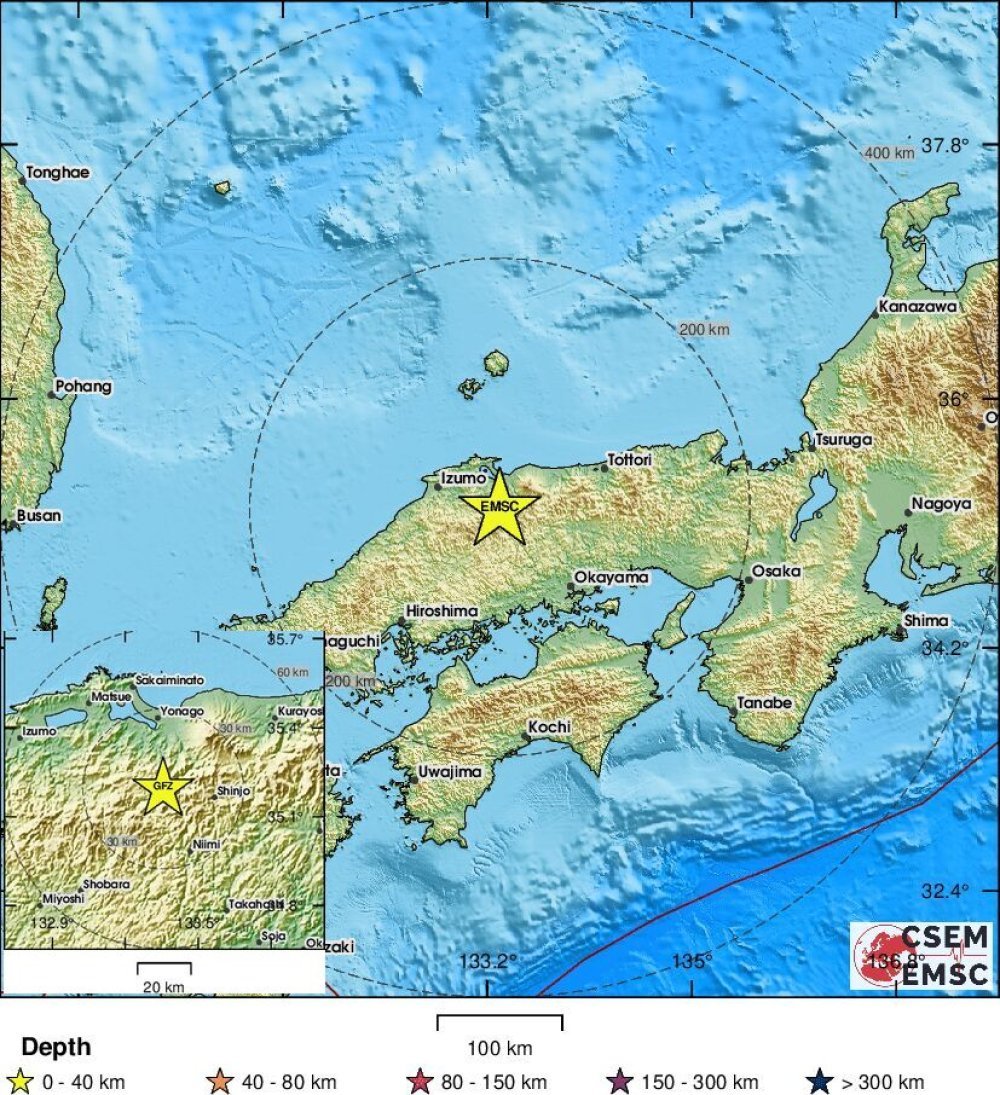 Epicentar prvog potresa bio je u istočnoj prefekturi Shimane, priopćila je agencija, dodajući da nema opasnosti od tsunamija. Chugoku Electric Power, koji upravlja nuklearnom elektranom Shimane udaljenom oko 32 km, priopćio je da se rad u njihovom bloku broj 2 nastavlja uobičajeno.