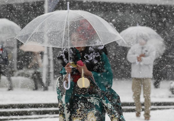No unatoč snijegu mnoštvo mladih Japanki odjevenih u kimono prisustvuje svečanosti proslave Dana punoljetnosti u Toshimaen zabavnom parku u Tokiju 14 siječnja 2013. Mladi diljem Japana su počašćeni posebnom ceremonijom kad navrše 20 godina.