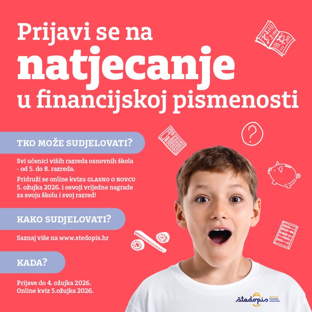 Udruga Štedopis - Institut za financijsko obrazovanje, uz podršku Addiko banke, već četvrtu godinu zaredom organizira za osnovnoškolce iz cijele Hrvatske natjecanje u financijskoj pismenosti, koje će se održati 5. ožujka 2026. godine putem online kviza 'Glasno o novcu'. Natjecanje je namijenjeno učenicima od 5. do 8. razreda osnovnih škola, a njegov je cilj jačanje financijskih znanja i vještina potrebnih za donošenje odgovornih financijskih odluka u svakodnevnom životu.