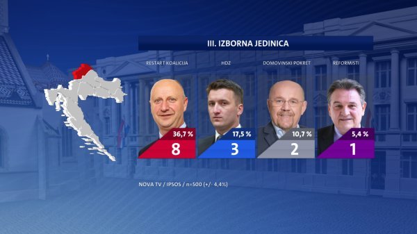 Nakon tri izborne jedinice HDZ i Restart su poravnati sa po 15 mandata. Domovinski pokret imao bi 9 zastupnika, a Most njih 2 i na kraju tu su Reformisti s jednim mandatom.