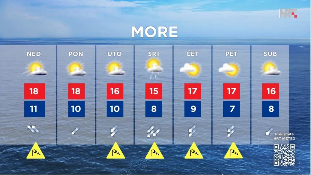 Na zapadu zemlje u početku pretežno sunčano, a u drugom dijelu dana sa sjevera postupan porast naoblake i vjerojatnosti za mjestimice kišu, uglavnom na riječkom području. Na sjevernom Jadranu slaba i umjerena bura i sjeverozapadnjak, a potkraj dana bura u jačanju. Poslijepodne temperatura od 13 °C u Gorskoj Hrvatskoj do 19 °C na moru.
