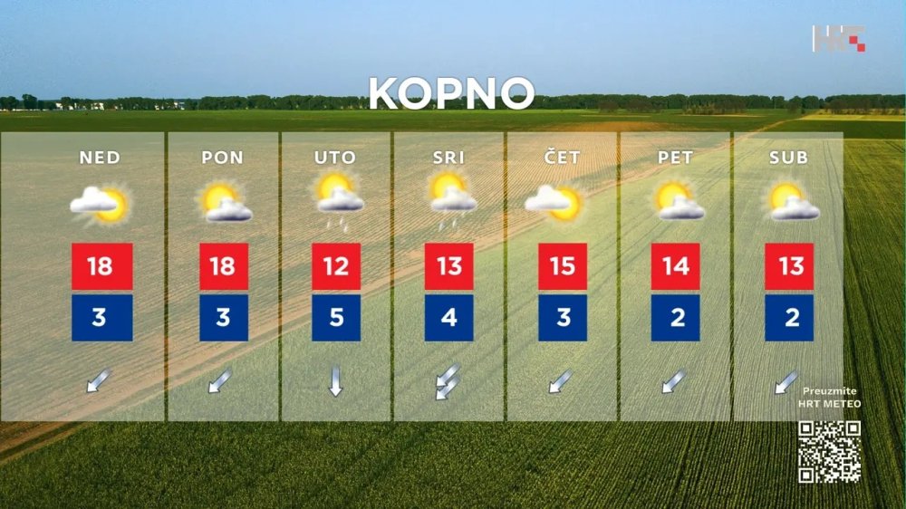 U ponedjeljak u Slavoniji, Baranji i Srijemu još pretežno sunčano, u drugom dijelu dana uz umjerenu naoblaku. Vjetar slab, potkraj dana umjeren sjeverni i sjeveroistočni. Temperatura zraka podjednaka ili samo malo niža od nedjeljne, navodi Tomislav Kožarić u prognozi DHMZ-a koju prenosi HRT.