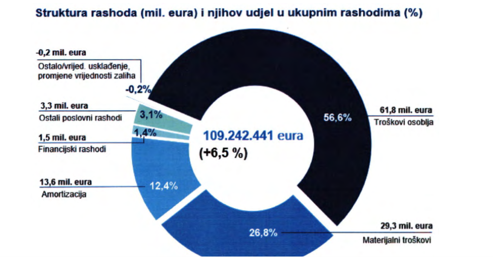 Pogleda li se rashodovna strana, najviše odlazi na troškove osoblja – 54,4 milijuna eura, odnosno 56,6 posto – a oni su veći u odnosu na isti period lani za 9,7 posto, dok na materijalne troškove otpada 26,8 posto.