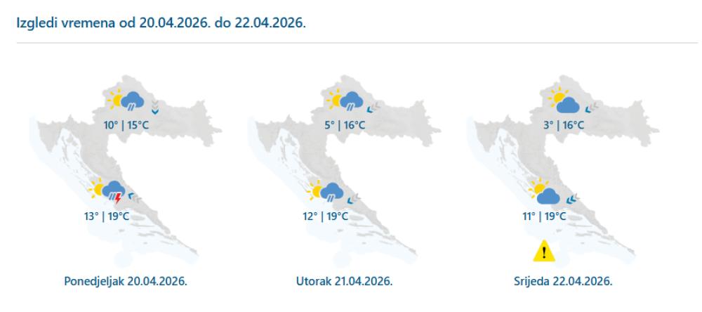U nedjelju će prijepodne u većini krajeva prevladavati sunčano vrijeme, no od sredine dana sa sjeverozapada stiže postupno naoblačenje. Poslijepodne se mjestimice očekuje kiša, najprije na sjevernom Jadranu, a zatim i u središnjoj i gorskoj Hrvatskoj, gdje su mogući i pljuskovi s grmljavinom.