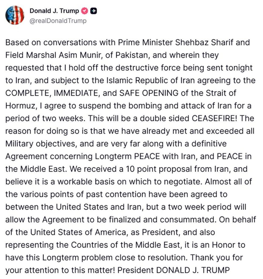 'Na temelju razgovora s pakistanskim premijerom Shehbazom Sharifom i feldmaršalom Asimom Munirom, koji su zatražili da odgodim razornu silu koja je večeras trebala biti usmjerena prema Iranu, te pod uvjetom da Islamska Republika Iran pristane na POTPUNO, ODMAH i SIGURNO OTVARANJE Hormuškog tjesnaca, pristajem obustaviti bombardiranje i napad na Iran na razdoblje od dva tjedna. To će biti obostrani PREKID VATRE!', objavio je Trump.