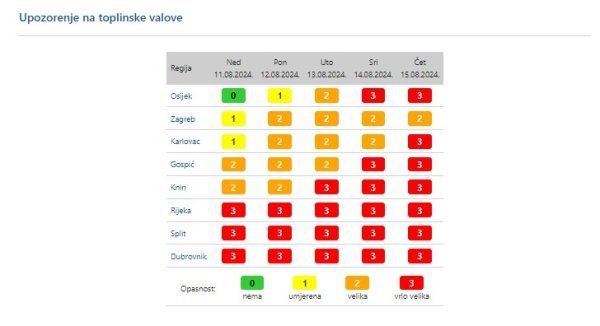 Za cijelu Hrvatsku izdan je meteoalarm kojim se upozorava na vrlo visoke temperature. Za obalno područje izdan je crveni, za unutrašnjost narančasti, a za istok Hrvatske žuti meteoalarm, no u svim tim regijama prognozira se temperatura iznad 35 stupnjeva. Podsjetimo, žuti meteoalarm znači da je vrijeme potencijalno opasno, narančasti da je opasno, a crveni da je izuzetno opasno.