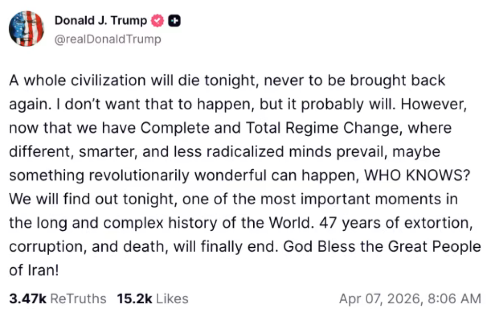 Sljedećeg jutra Trump je, u objavi punoj psovki, poručio Iranu da 'otvori prokleti tjesnac, vi ludi gadovi, ili ćete završiti u paklu', zaključivši poruku riječima: 'Neka je slava Alahu.' Dana 7. travnja dodatno je zaprijetio da će 'čitava civilizacija večeras nestati' ako Iran ne pristane otvoriti tjesnac.