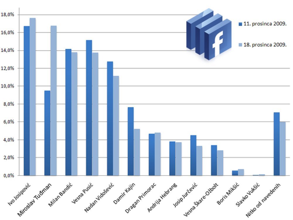 Pravo iznenađenje naših izbora na Facebooku je gospodin Miroslav Tuđman koji se sa nešto manje od 10 posto glasova prije tjedan dana, popeo na gotovo 17 posto. On je uz Ivu Josipovića koji je narastao za nešto manje od jedan posto jedini kandidat koji je 'u plusu'. Potpora svim ostalim kandidatima pala je ili je ostala jednaka kao i prije tjedan dana.