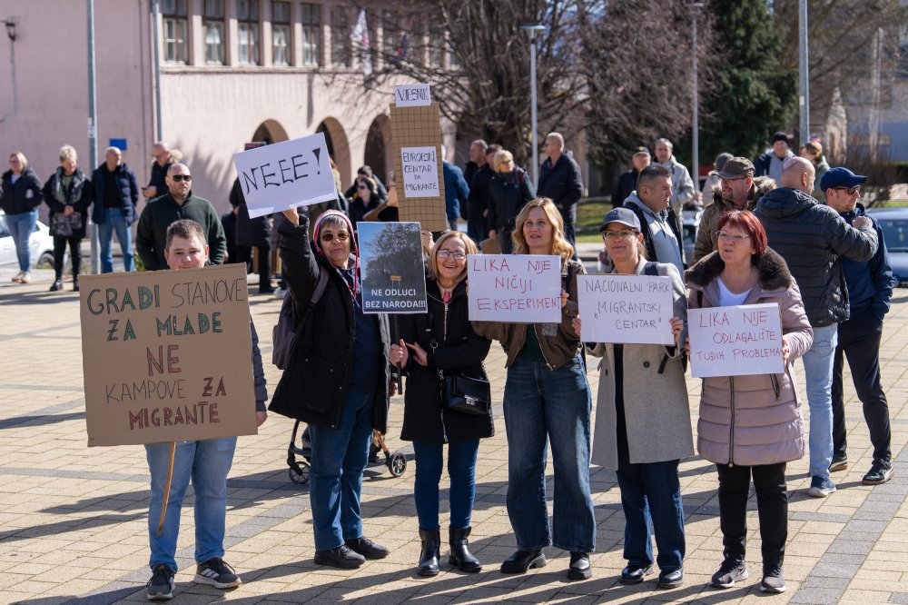 Nekoliko stotina građana prosvjedovalo je u nedjelju u organizaciji Općine Plitvička Jezera protiv namjere da se na području bivšeg vojnog aerodroma Željava uspostavi centar za migrante