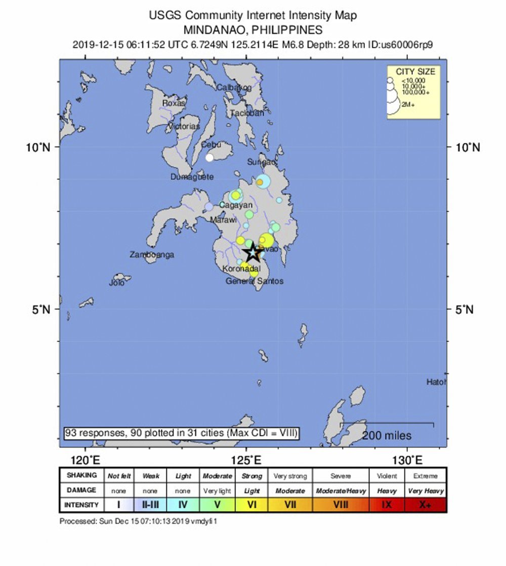 Epicentar je bio devet kilometara od Matanaoa, 987 kilometara južno od Manile, objavio je Institut za vulkanologiju i seizmologiju.