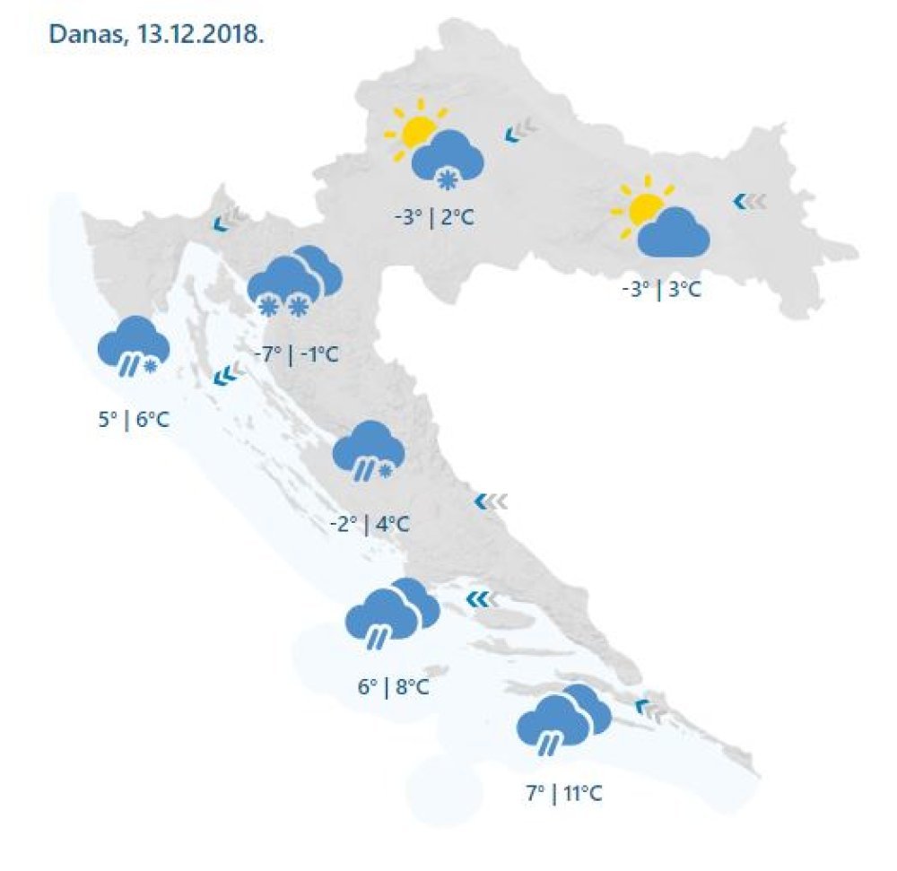 Na sjevernom Jadranu će biti promjenljivo, povremeno s kišom, a uz obalu može biti i snijega nošenog burom. Puhat će većinom umjerena, ponegdje i jaka bura s olujnim udarima. Jutarnja temperatura oko -7 stupnjeva, uz obalu od 3 do 6, a najviša dnevna kretat će se oko nule, dok će na moru ona biti između 6 i 8 stupnjeva Celzija.