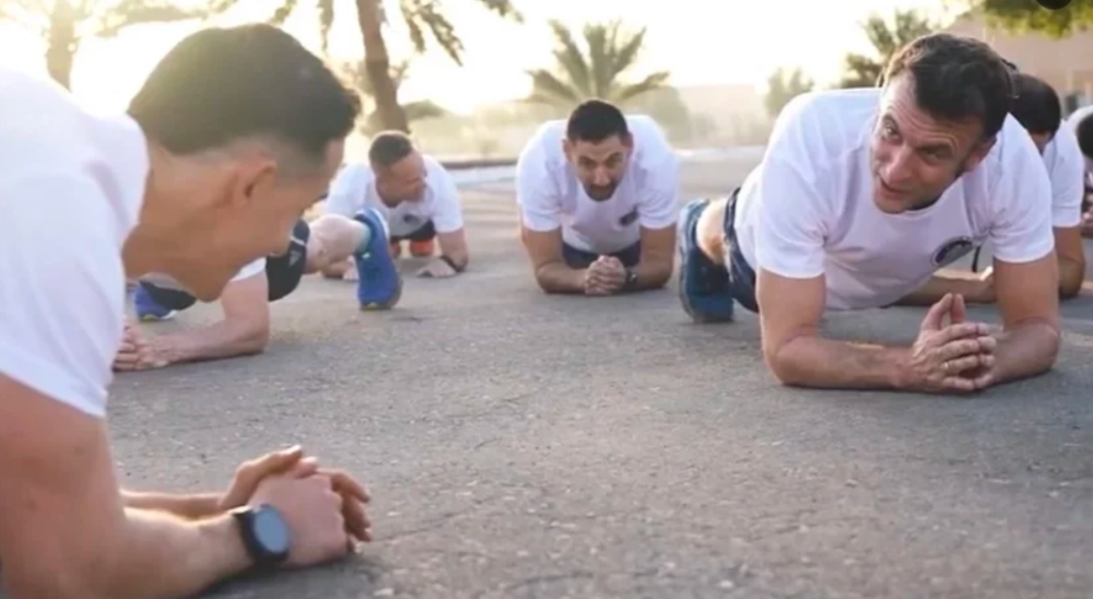 Snimke, koje su objavljene u ponedjeljak, prikazuju Macrona kako vježba s vojnicima, pri čemu se nije libio ni odraditi 'plank'. Naime, s Macron je u posjet francuskim vojnicima stigao jedan od najpoznatijih francuskih YouTubera — Tibo InShape, specijaliziran za teme bodybuildinga. Održao je mali trening s francuskom vojskom, kojem se pridružio i Macron.