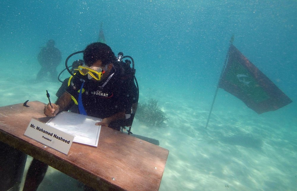 Svraćajući pozornost javnosti na opasnosti od klimatskih promjena, a prije važnog UN-ova sastanka o klimi u prosincu u Kopenhagenu, vlada predsjednika Mohameda Našidada okupila se na dnu tirkizno plave lagune.