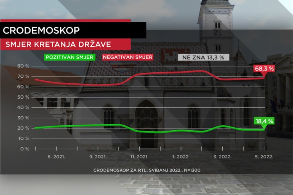 Manjak društvenog optimizma vidljiv je i u svibnju. Tek nešto više od 18 posto ispitanika smatra da zemlja ide u dobrom smjeru, a 68,3 posto smjer ocjenjuje pogrešnim (prošlog mjeseca je bilo manje od 18,6 posto optimističnih, a 67,6 posto ispitanika smatralo je da idemo u pogrešnom smjeru). Optimistični su najčešće glasači vladajućeg HDZ-a (52,5 posto), ali i među njima 31,8 posto smatra da idemo u pogrešnom smjeru.