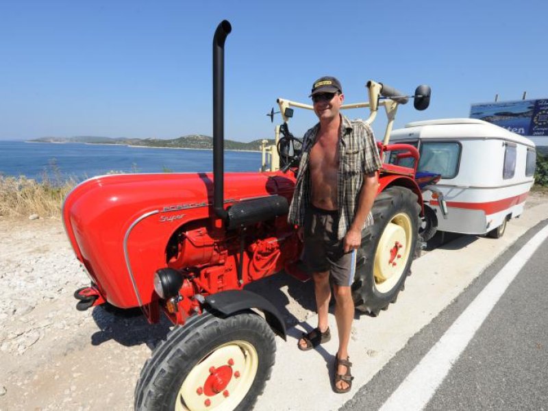 Strastveni kolekcionar traktora Wolfgang Voight (44) iz Göttingena svojim traktorom i kućicom za kampiranje stigao je i do šibenske rivijere. Na Porscheovom traktoru iz 1958. godine, snage 35 KS i maksimalne brzine 31 km/h, došao je od Njemačke do Istre, preko Krka, Raba, Zadra do Šibenika. Zatekli smo ga kod Bilog nedaleko od Primoštena, pišu 24 sata
