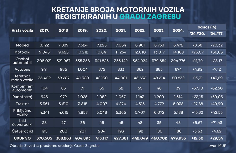 Krajem 2020. godine u Zagrebu ih je bilo registrirano 413.117, a do kraja 2024. taj je broj porastao za 12,3 posto, na 479.955.