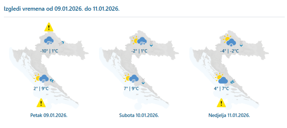 DHMZ za sutra prognozira pretežno oblačno, na Jadranu s kišom, a u unutrašnjosti i susnježicom te snijegom. Lokalno obilnija oborina moguća je na Jadranu i u gorskoj Hrvatskoj. U unutrašnjosti je velika vjerojatnost kiše koja se smrzava u dodiru s podlogom, osobito na istoku.